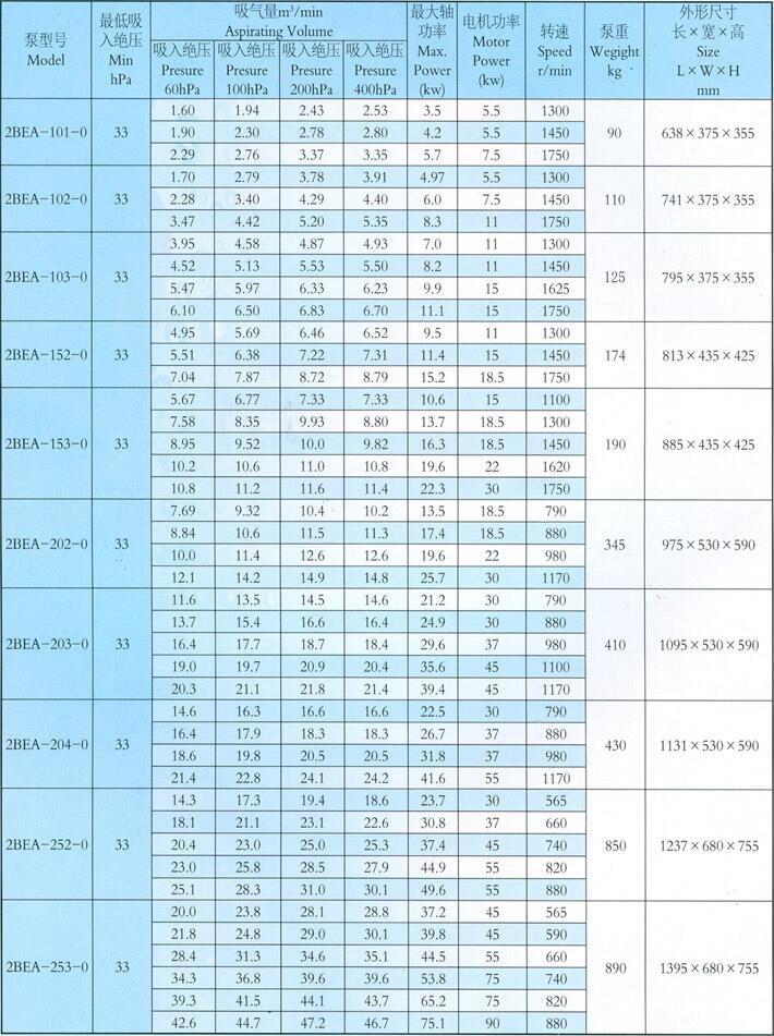 2BEA水環式真空泵技術參數: